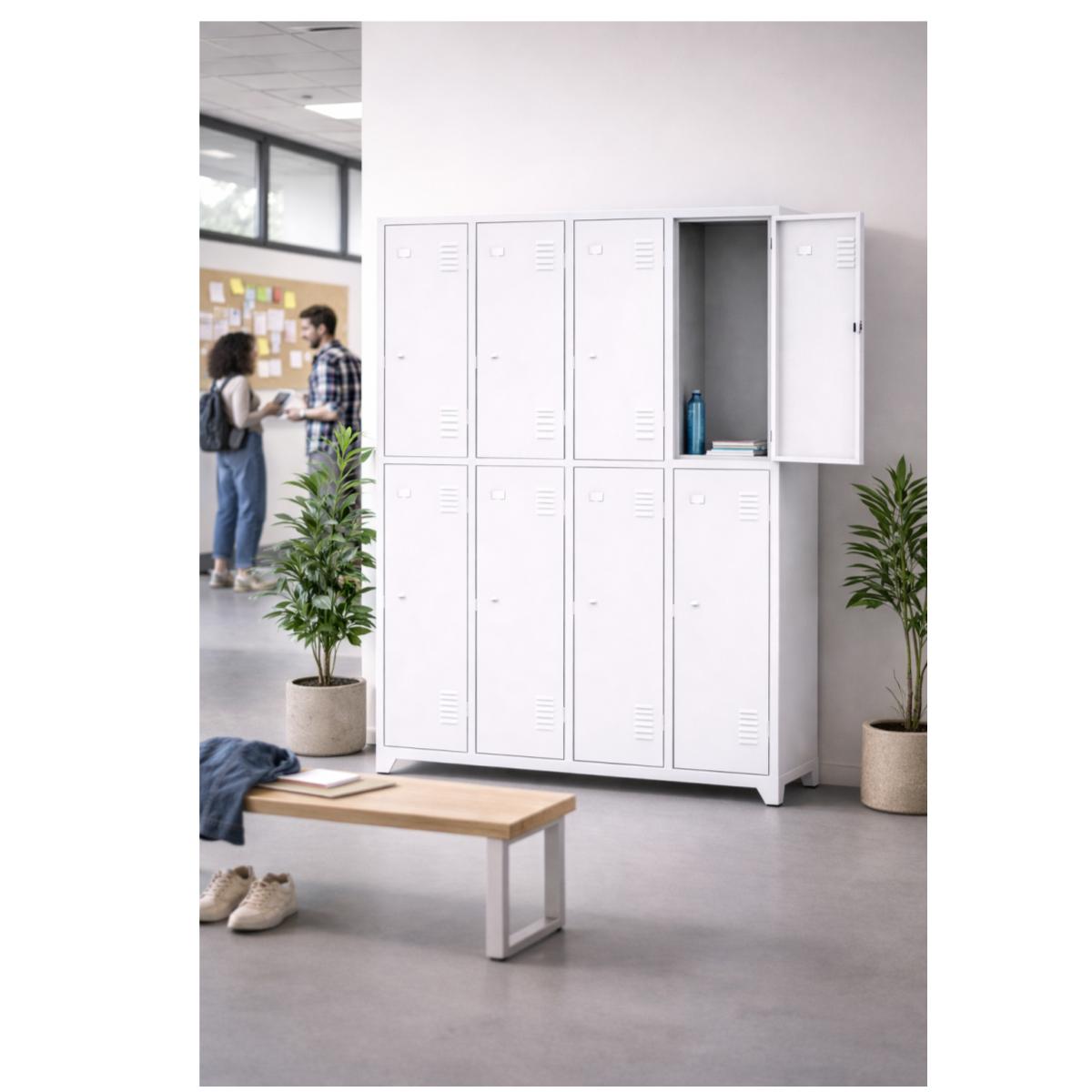 O roupeiro metálico de 8 portas é ideal para uso coletivo, permitindo que várias pessoas utilizem compartimentos individuais, mantendo organização, higiene e segurança no ambiente.