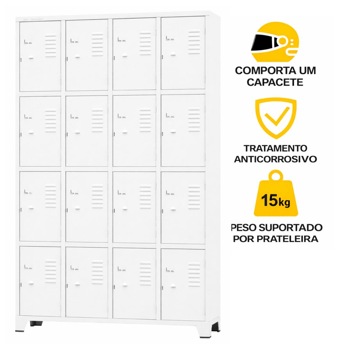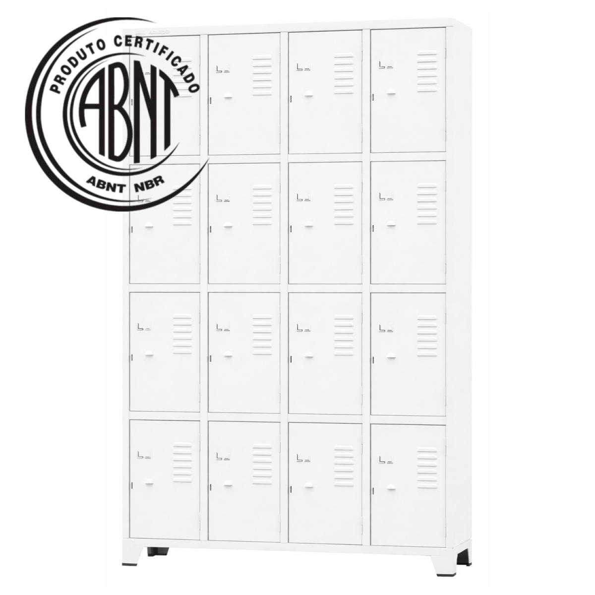 O roupeiro metálico de 16 portas é ideal para uso coletivo, permitindo que várias pessoas utilizem compartimentos individuais, mantendo organização, higiene e segurança no ambiente.