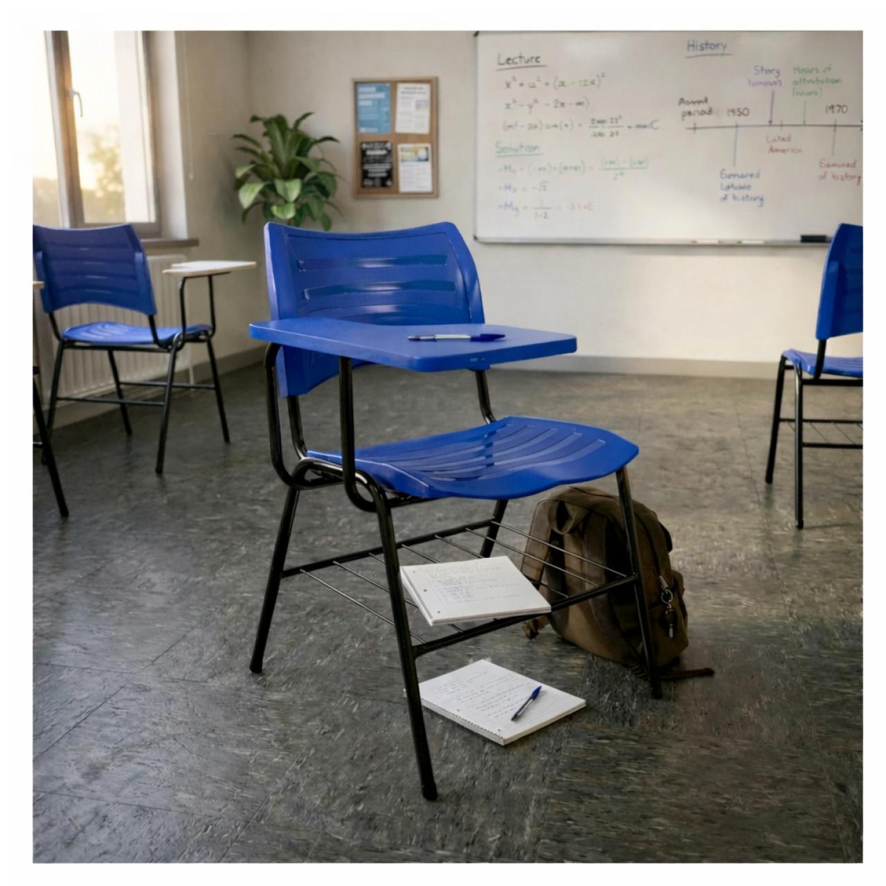 Cadeira universitária com prancheta lateral fixa, desenvolvida para ambientes educacionais, treinamentos, cursos profissionalizantes, igrejas e auditórios. Combina resistência estrutural, ergonomia e praticidade, oferecendo conforto e funcionalidade no uso diário.