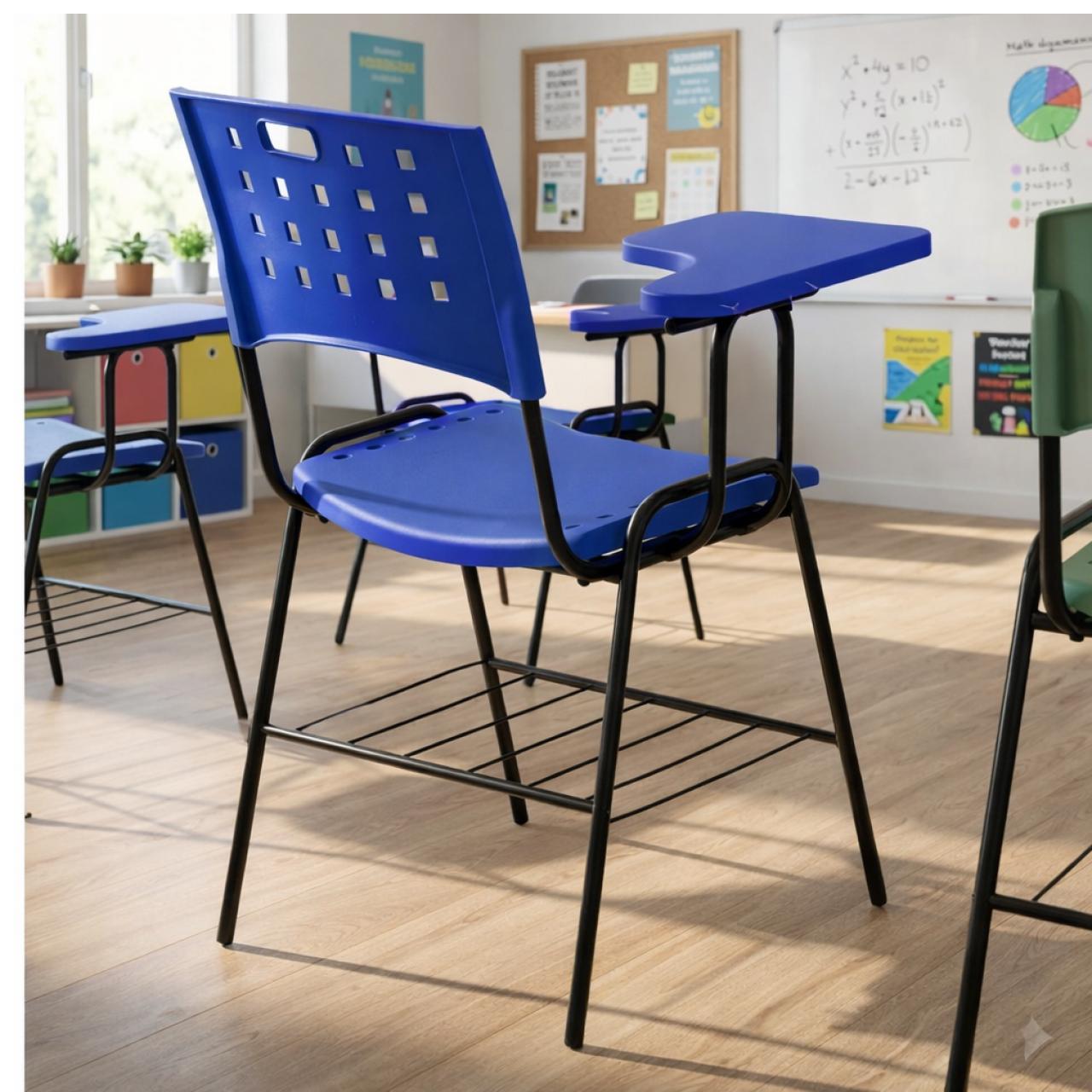 Cadeira universitária com prancheta lateral fixa, desenvolvida para ambientes educacionais, treinamentos, cursos profissionalizantes, igrejas e auditórios. Combina resistência estrutural, ergonomia e praticidade, oferecendo conforto e funcionalidade no uso diário.