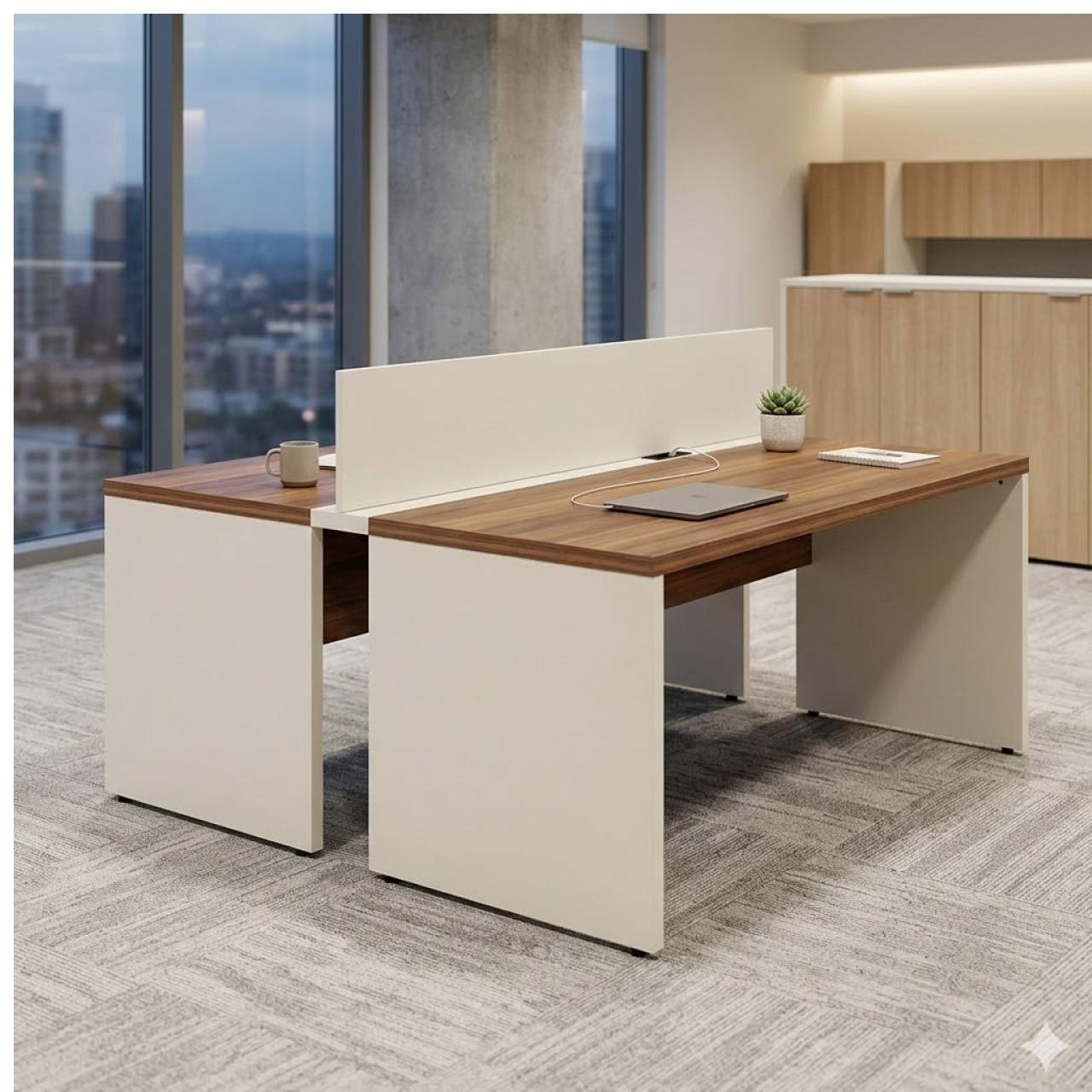 A Estação de Trabalho Dupla é a solução ideal para empresas que buscam otimização de espaço, organização e produtividade no ambiente de escritório. Com design contemporâneo e acabamento sofisticado, o conjunto permite acomodar dois usuários com conforto e privacidade, graças à divisória central equipada com pontos para tomadas.