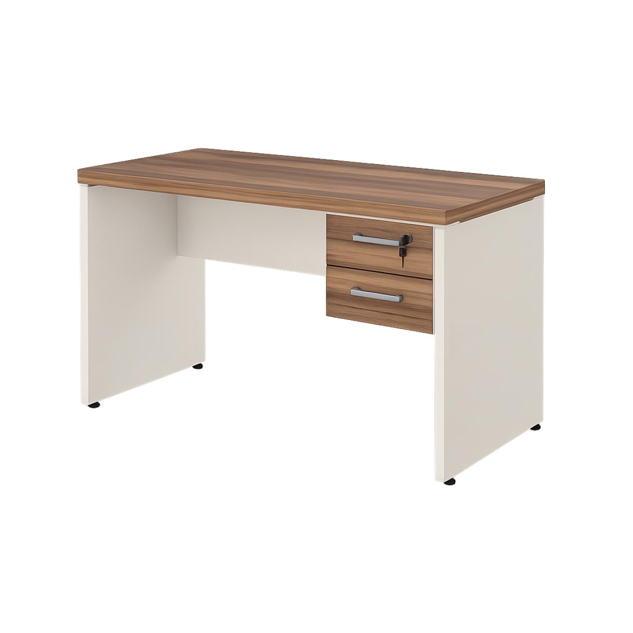 As laterais (pés painel) em 25mm garantem a sustentação necessária com um visual equilibrado, enquanto a combinação de cores — tampo amadeirado escuro nogal sevilha e base em tom champanhe claríssimo — traz modernidade ao ambiente de trabalho.