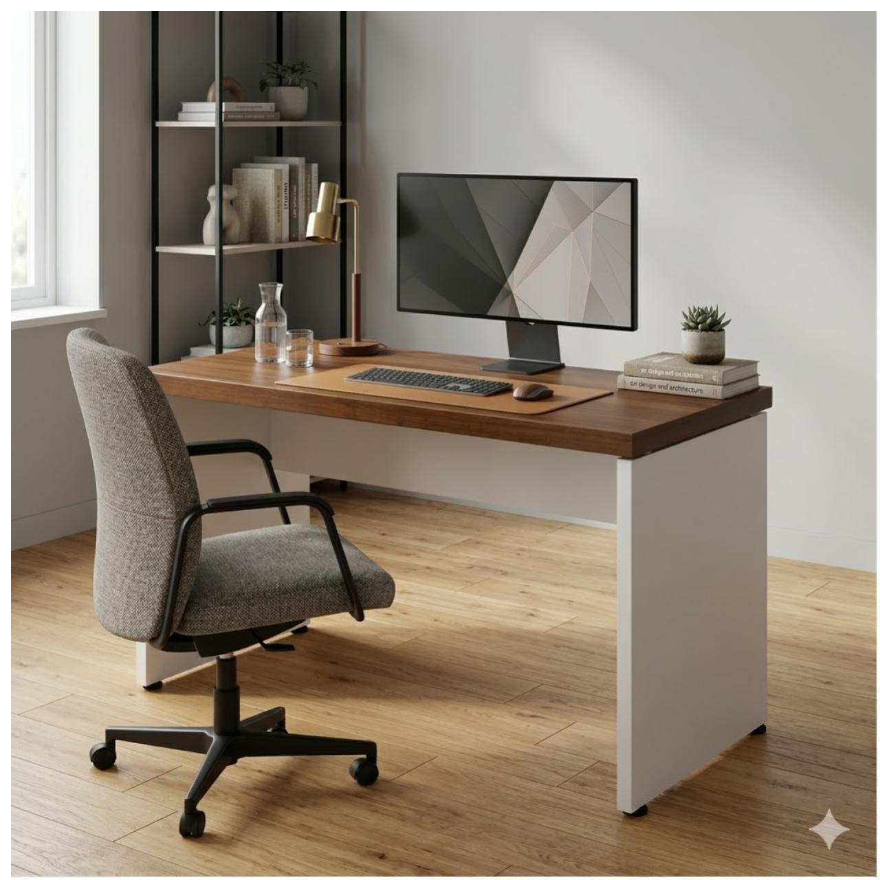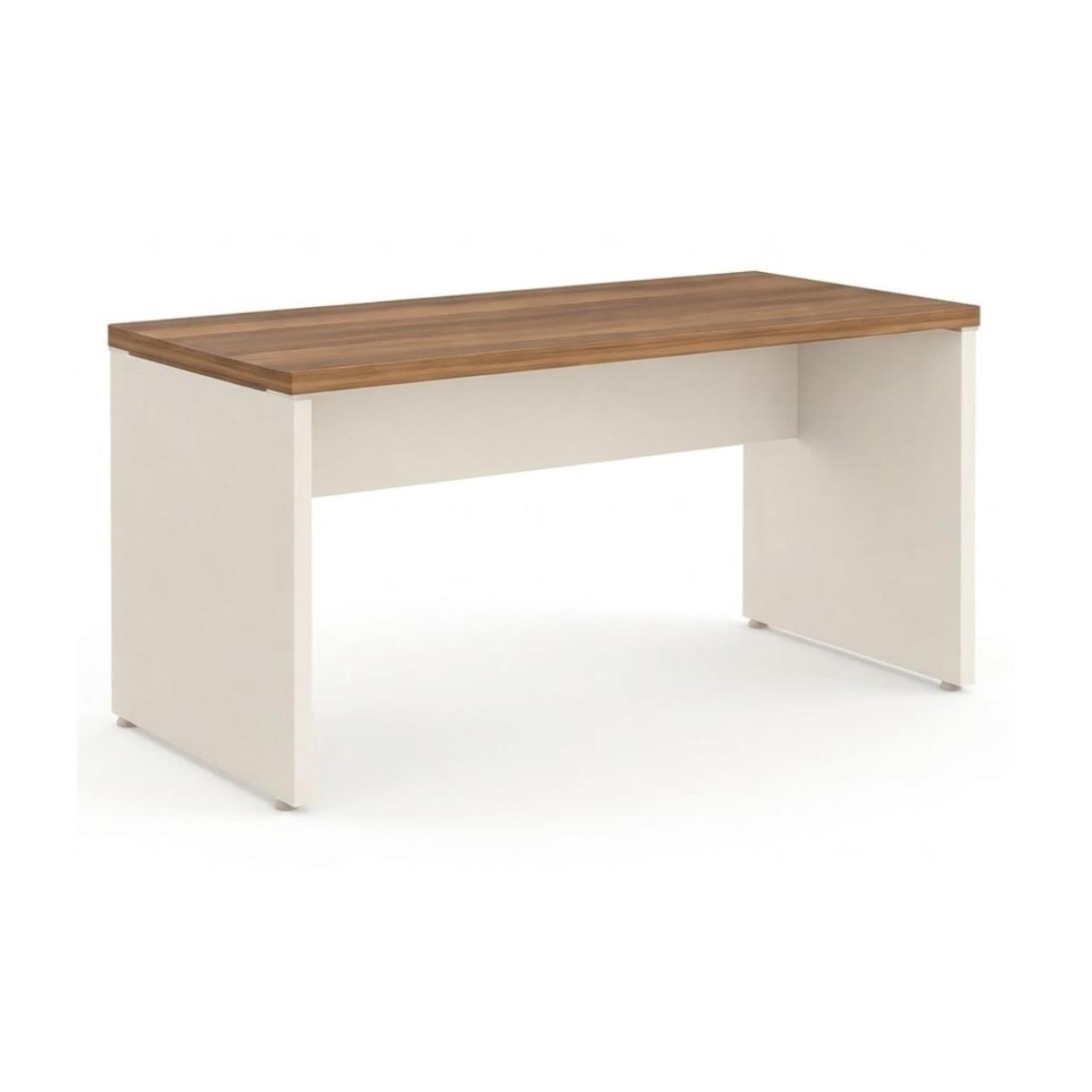 As laterais (pés painel) em 25mm garantem a sustentação necessária com um visual equilibrado, enquanto a combinação de cores — tampo amadeirado escuro nogal sevilha e base em tom champanhe claríssimo — traz modernidade ao ambiente de trabalho.