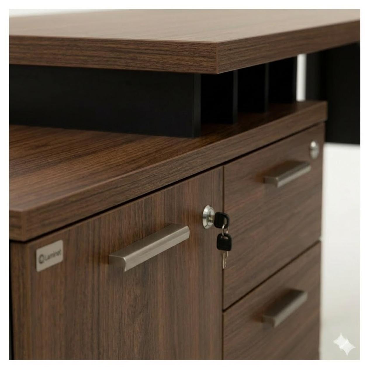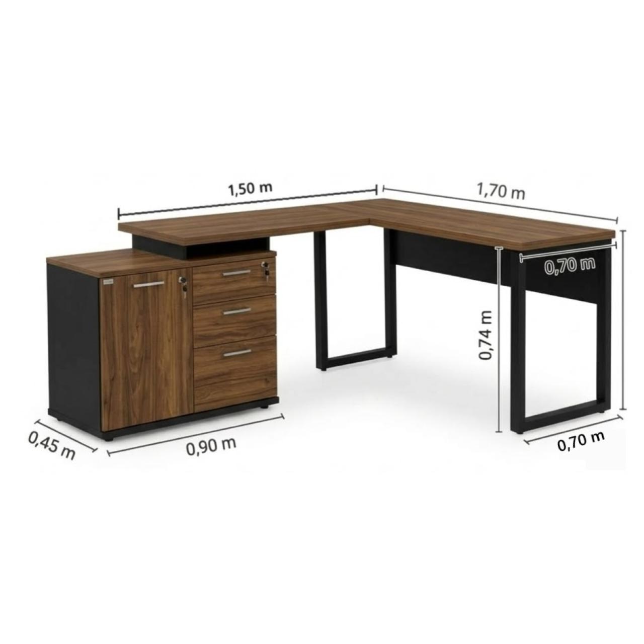 A configuração em L permite que o usuário utilize duas áreas distintas de trabalho, sendo ideal para quem utiliza computador, documentos e equipamentos simultaneamente. O armário e as gavetas integradas aumentam a capacidade de organização, mantendo o ambiente sempre limpo e funcional.