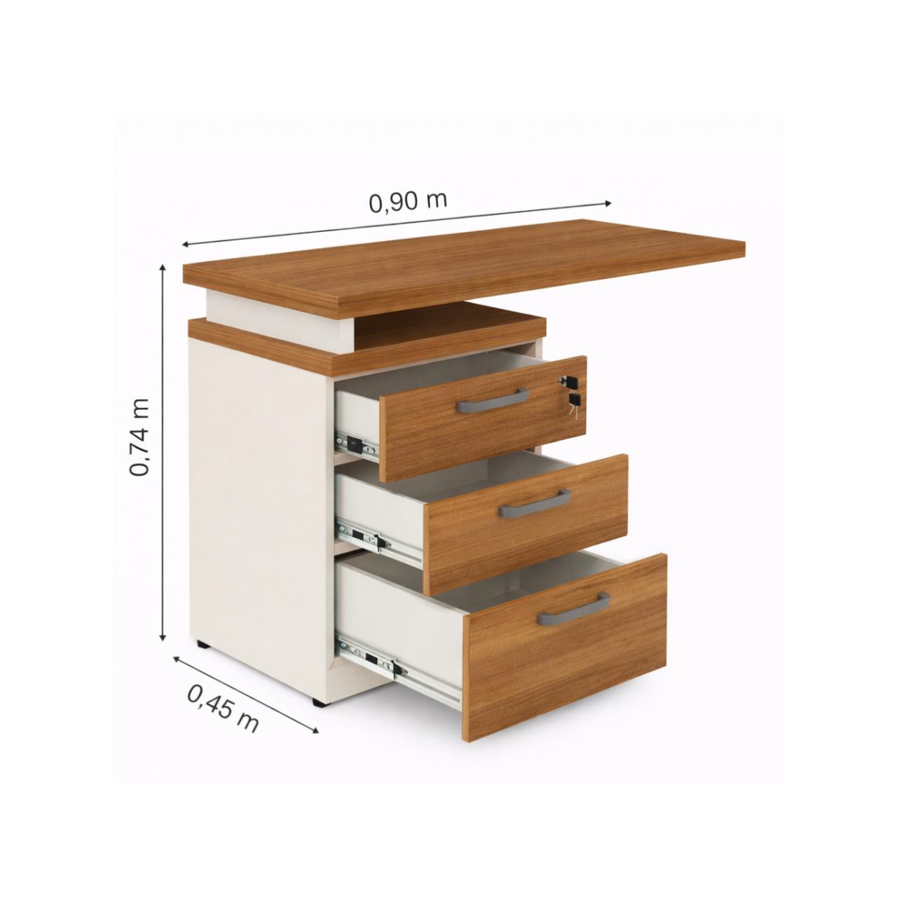 A profundidade do tampo auxiliar na região do gaveteiro é de 0,45 m, otimizando o espaço de circulação no ambiente.