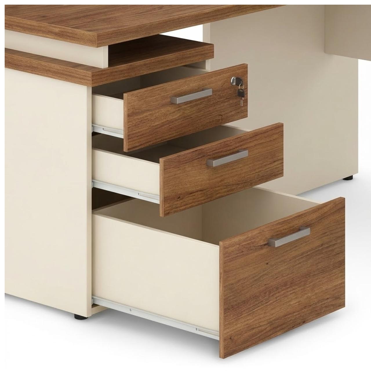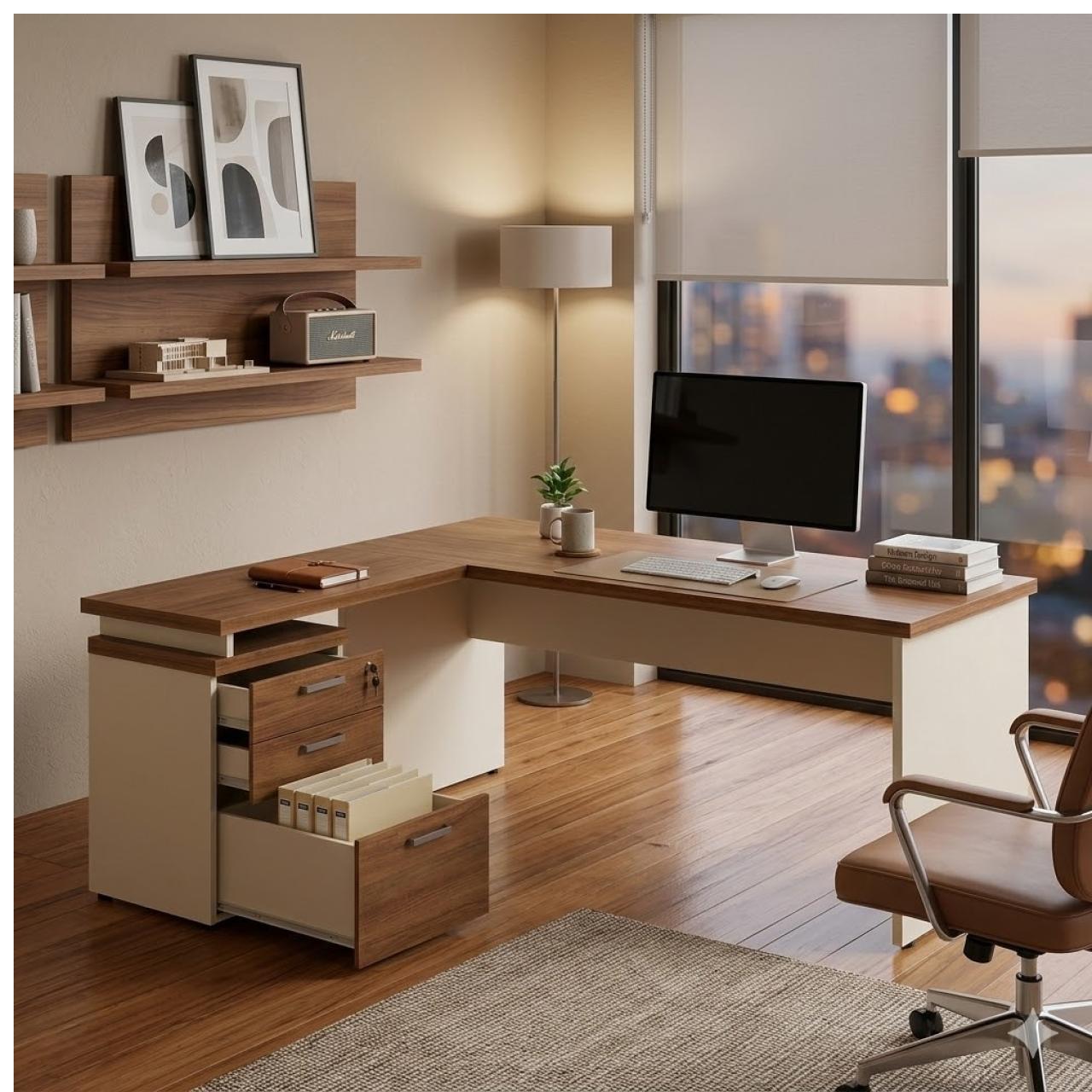Seu formato ergonômico em “L” proporciona uma transição suave entre a área de computador e a área de atendimento ou escrita, mantendo tudo ao alcance das mãos. O gaveteiro integrado de 3 gavetas com fechadura garante a segurança de documentos e itens pessoais, mantendo o tampo sempre livre e organizado.
