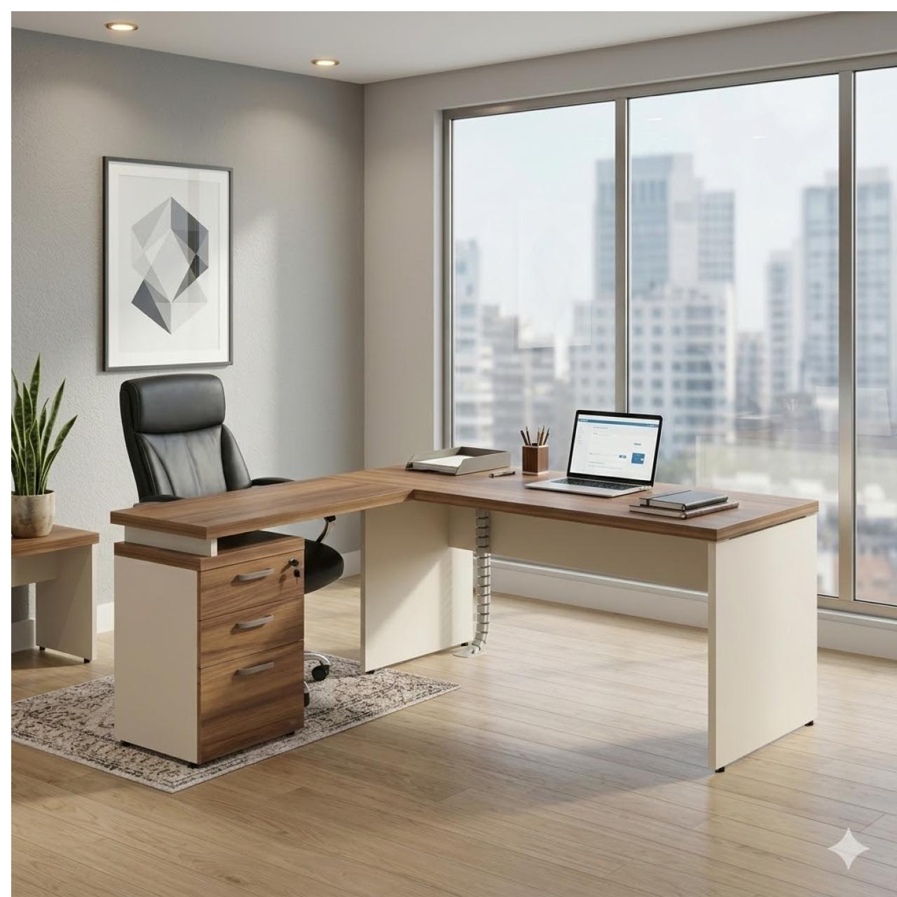 A Mesa Diretor em L combina funcionalidade, ergonomia e um design sofisticado para ambientes profissionais que exigem amplitude e organização. Com um acabamento amadeirado elegante contrastando com a base clara, este móvel é a solução ideal para quem busca otimizar o espaço de trabalho sem abrir mão da estética.