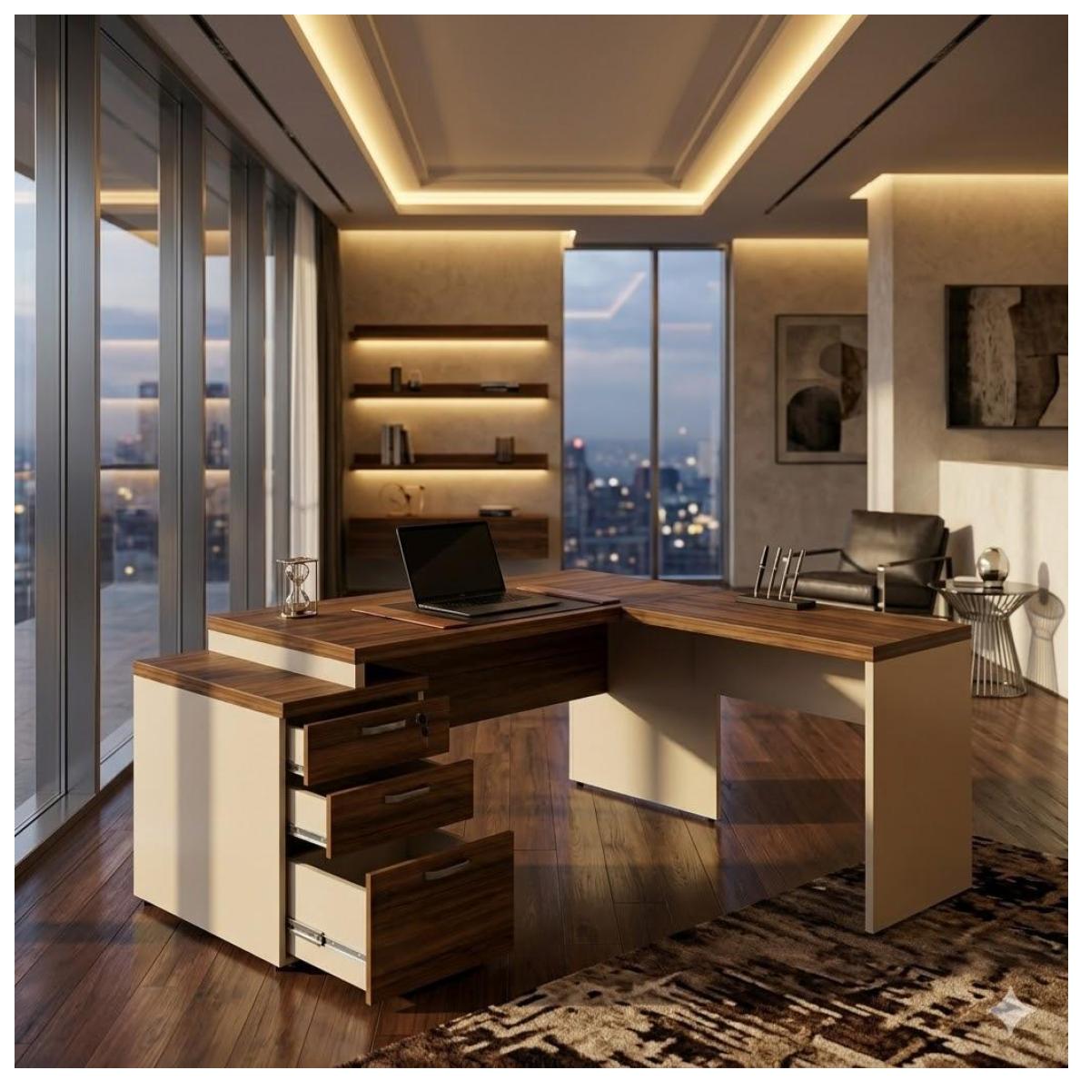 Seja para gerenciar sua empresa ou para longas jornadas de estudo, esta mesa de canto (escritório em L) proporciona ergonomia avançada e um acabamento premium que eleva a estética do seu ambiente, transmitindo profissionalismo e credibilidade.