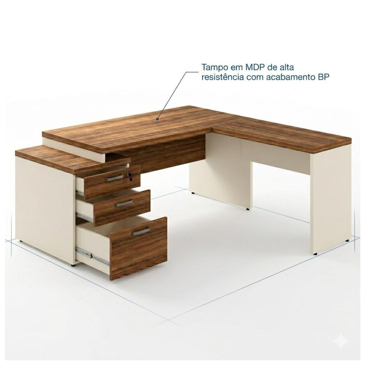 Mesa de Escritório em L Diretor Prime 192x160cm com tampo 40mm. Ideal para Home Office e Corporativo. Com gaveteiro para pasta suspensa e sapatas niveladoras. Confira!