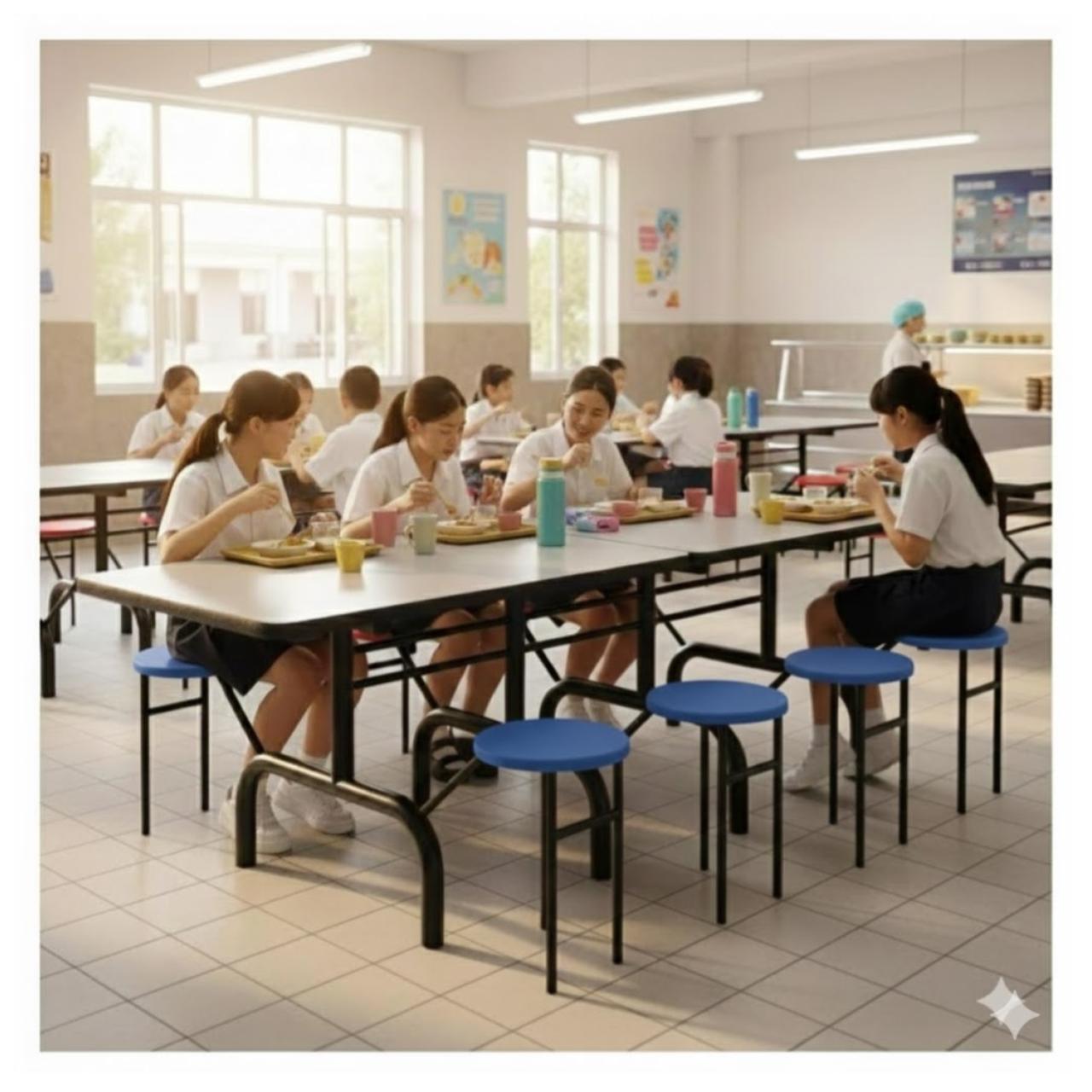 Mesa coletiva de refeitório com bancos Escamoteáveis integrados, ideal para uso em ambientes institucionais, industriais, escolares e corporativos. Estrutura metálica reforçada e assentos individuais acoplados garantem durabilidade, praticidade e organização do espaço.
