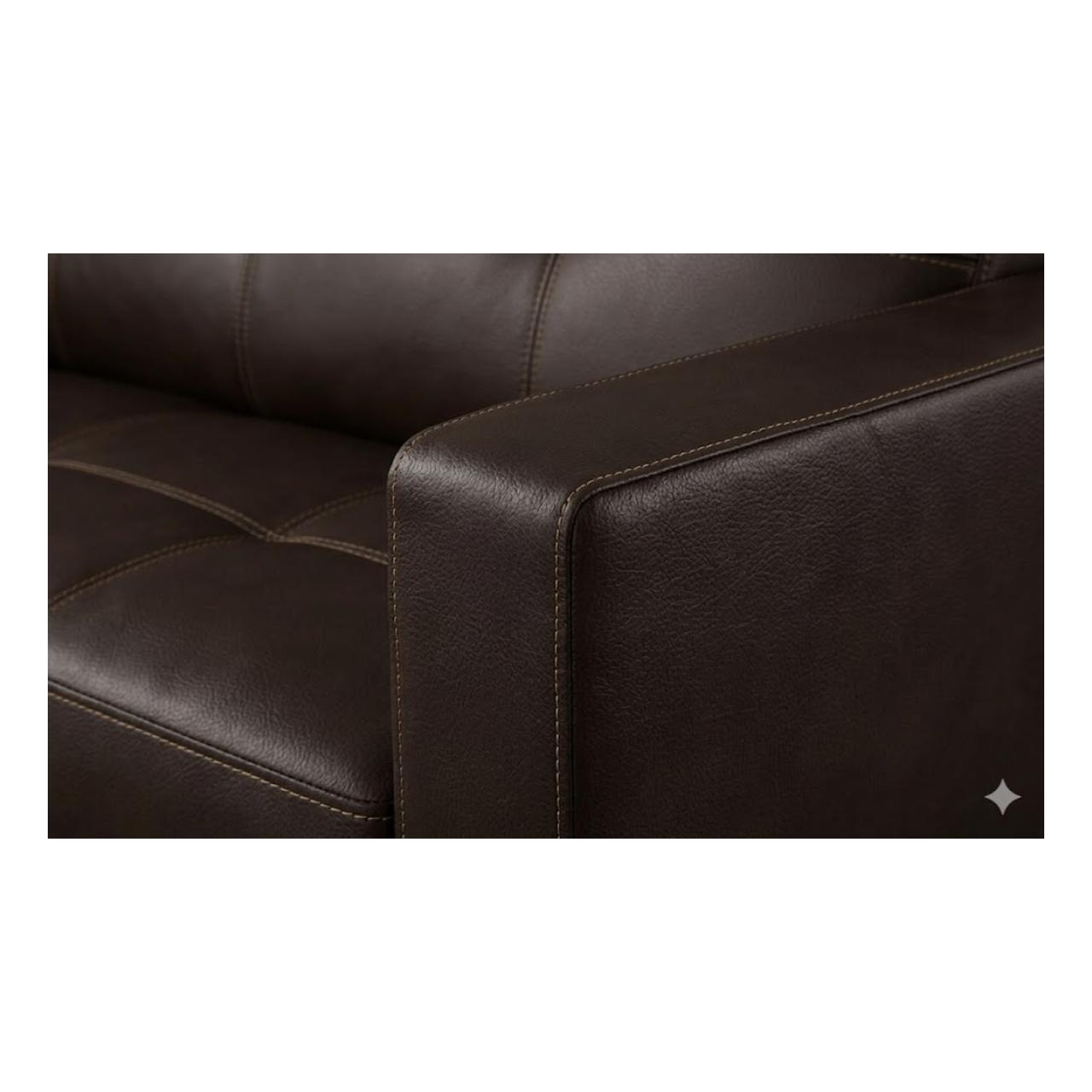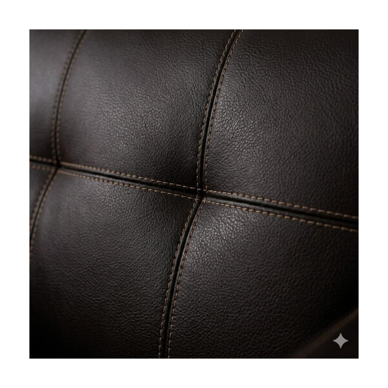 Acabamento: O revestimento em material sintético (PU) na cor café possui um brilho acetinado, conferindo sofisticação e facilidade na limpeza.